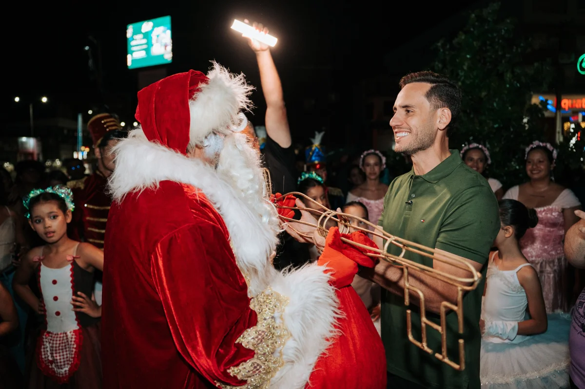 O prefeito Affonso Cândido (PL) participou da abertura oficial e realizou a entrega simbólica das chaves da Casa do Papai Noel ao Bom Velhinho, marcando oficialmente o início das atividades do espaço, preparado para receber crianças e visitantes durante todo o período natalino.