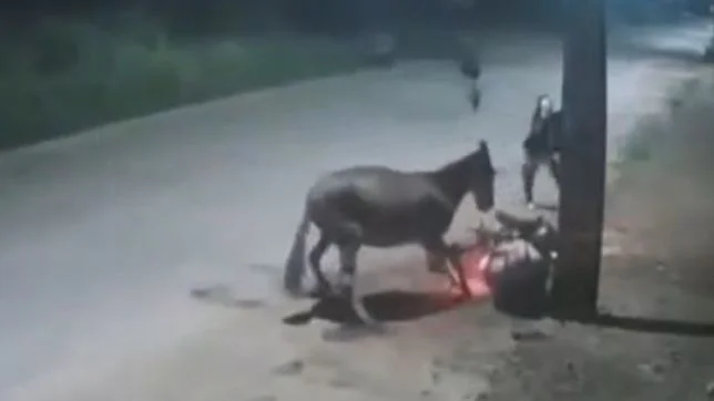 Acidente e assalto: cavalo solto provoca queda de motociclista e facilita roubo. VEJA VÍDEO