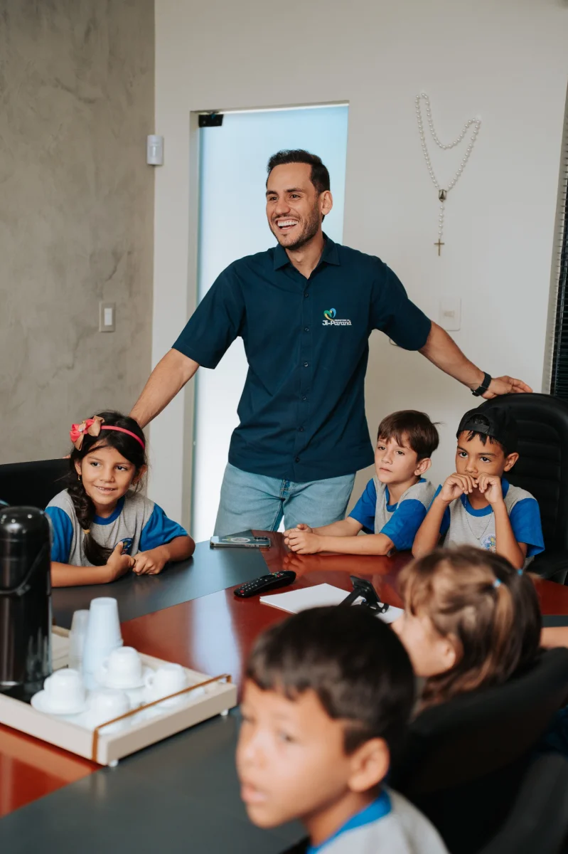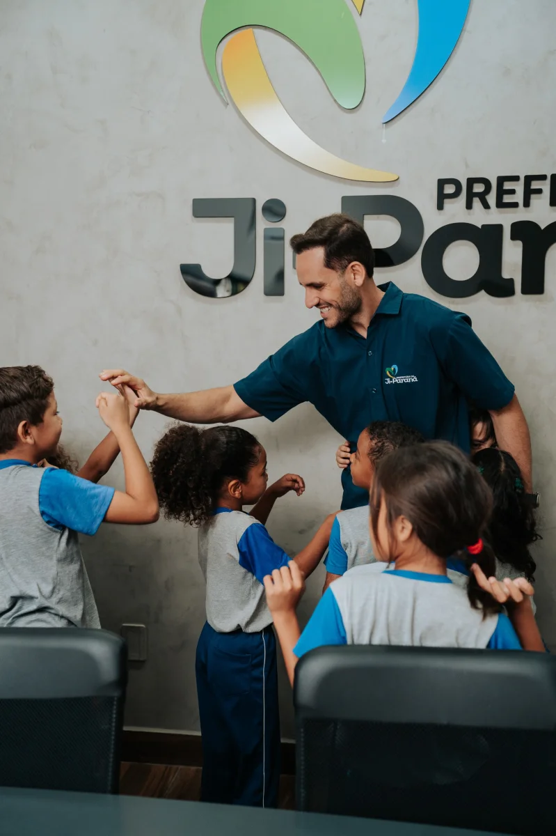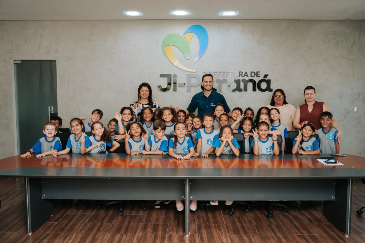 Nos dias que antecedem as comemorações dos 48 anos de emancipação de Ji-Paraná, o prefeito Affonso Cândido (PL) recebeu, na segunda-feira (17), alunos dos 1º anos A e B da Escola Municipal Moisés Umbelino Gomes. A visita ao Palácio Urupá, sede da administração municipal, teve como objetivo aproximar as crianças da rotina de trabalho do chefe do Executivo e apresentar o funcionamento da gestão pública.