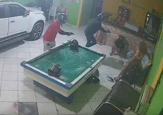 Nas imagens é possível ver que as duas vítimas estavam no estabelecimento na companhia de uma mulher. Em determinado momento, a dupla de assassinos chega no local, em uma moto. Os bandidos usavam capacete e entraram no bar já com arma em punho.