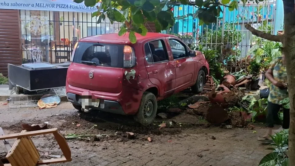 Com o impacto, o carro invadiu a calçada de uma pizzaria e passou ao lado de um restaurante que funciona no mesmo ponto comercial. No momento do acidente, algumas cadeiras estavam dispostas em frente ao estabelecimento.