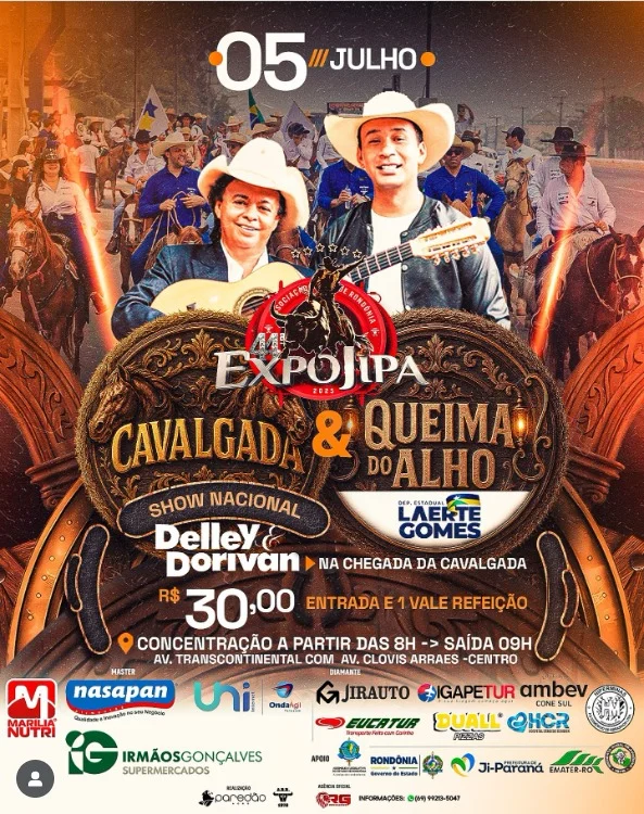 Após a cavalgada, acontece a “Queima do Alho Laerte Gomes” como show nacional de Delley & Dorivan no Parque de Exposição Hermínio Victorelli. A entrada será de R$ 30,00 que valerá um almoço com comida raiz. O show é patrocinado pelo deputado estadual, Laerte Gomes (PSD). Os ingressos podem ser adquiridos no parque de exposição ou no portão de entrada na T-18.