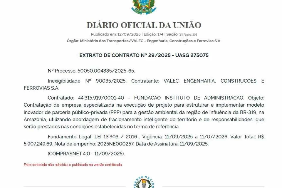Porto Velho, RO – O Diário Oficial da União desta sexta-feira (12) publicou o extrato do Contrato nº 29/2025, firmado entre a Valec Engenharia, Construções e Ferrovias S.A., vinculada ao Ministério dos Transportes, e a Fundação Instituto de Administração (FIA). O processo está registrado sob o nº 50050.004885/2025-65 e foi formalizado por inexigibilidade de licitação nº 90035/2025, conforme prevê a Lei nº 13.303/2016, conhecida como Lei das Estatais.