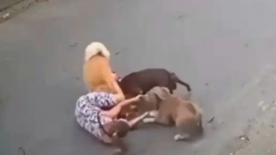 Os pit monsters chegam perto e a mulher tenta afastá-los com a perna. Após rodopiar com os cães, ela cai na rua e tenta segurar os cachorros. Um carro e alguns pedestres chegam para ajudar. Câmeras de segurança registraram o momento.