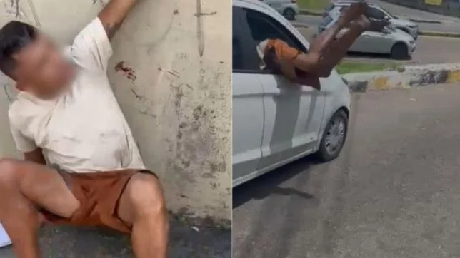 Nos instantes finais, o homem surpreende ao pular pela janela de um carro na tentativa de escapar das agressões. Até o momento, não há informações sobre onde o caso aconteceu.