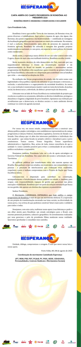 Durante visita oficial a Rondônia, no último dia 8 de agosto, o presidente Luiz Inácio Lula da Silva recebeu uma carta aberta do Movimento Caminhada Esperança, coalizão formada por partidos de esquerda, centro-esquerda e movimentos sociais. O documento foi entregue pessoalmente pelo senador Confúcio Moura (MDB-RO), presidente estadual do MDB; pela deputada estadual Cláudia de Jesus (PT-RO); e pelo ex-senador Acir Gurgacz (PDT-RO), líder do PDT no estado.