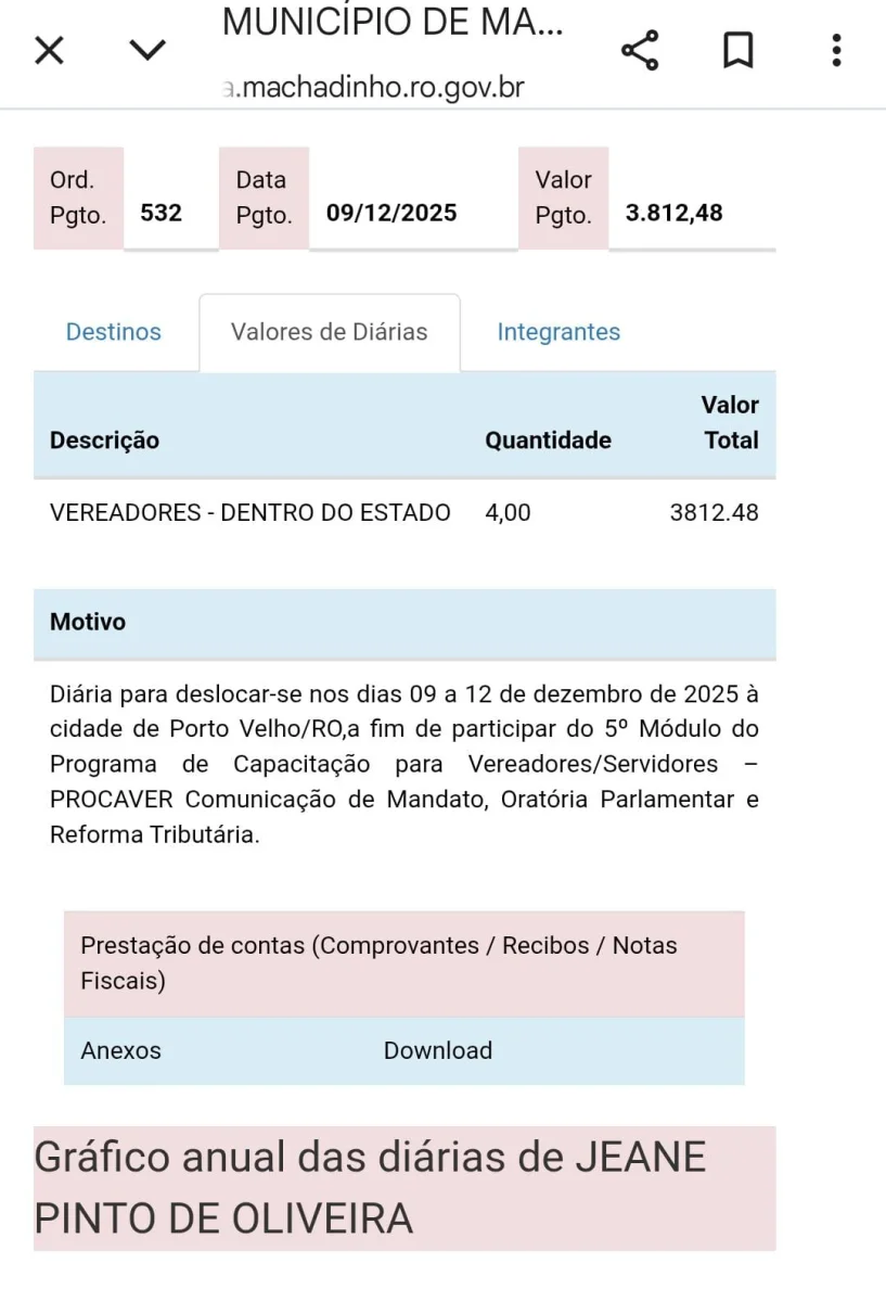 Os dados utilizados para apuração desta matéria foram extraídos do Portal da Transparência da Câmara Municipal de Machadinho d’Oeste, onde constam todas as diárias pagas aos vereadores e servidores.