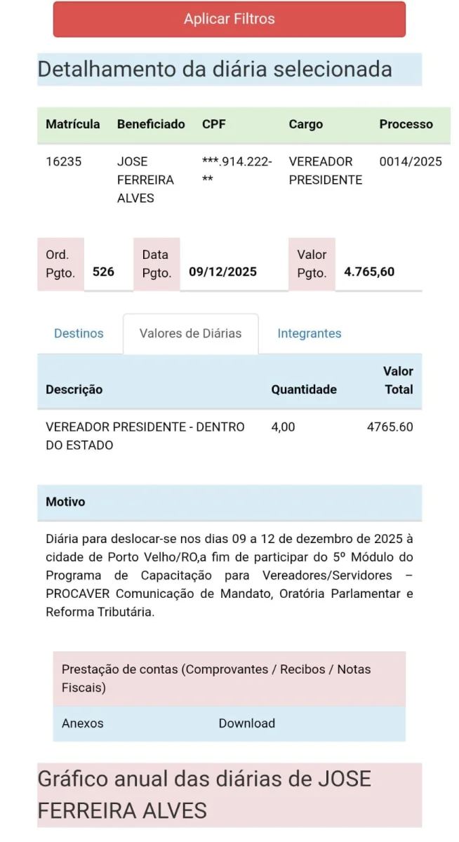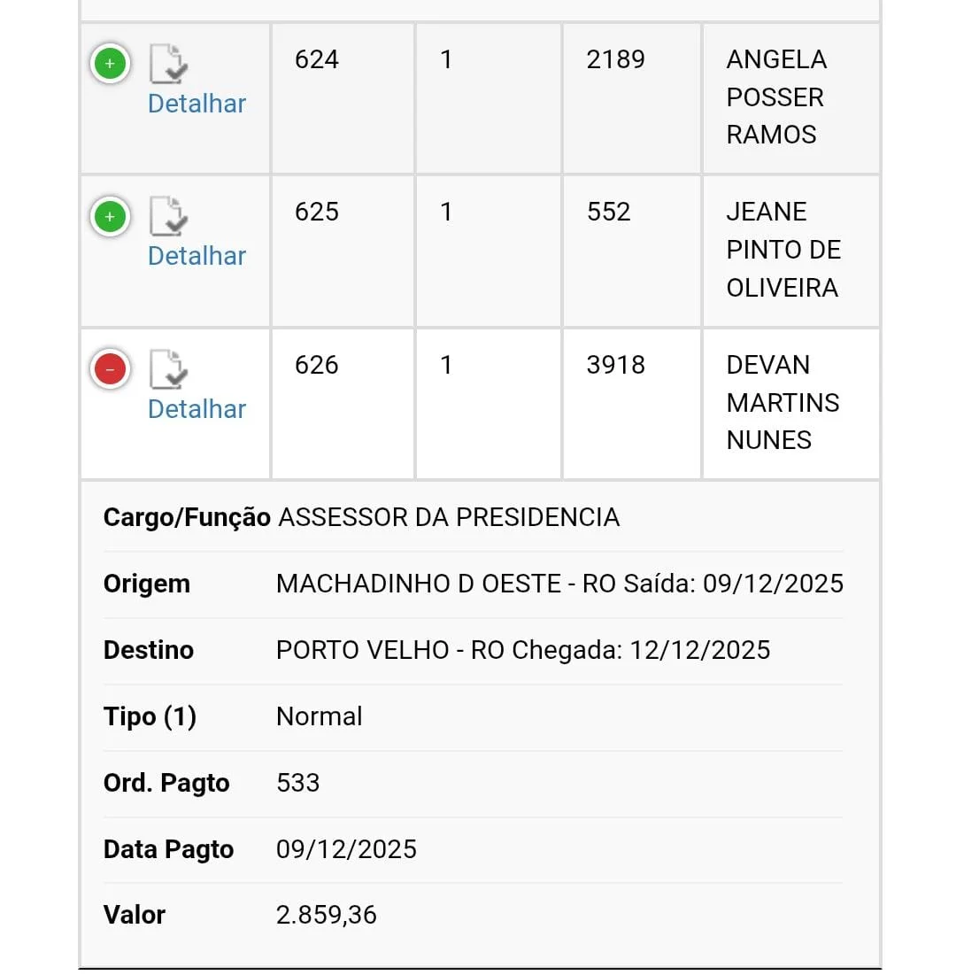 Os dados utilizados para apuração desta matéria foram extraídos do Portal da Transparência da Câmara Municipal de Machadinho d’Oeste, onde constam todas as diárias pagas aos vereadores e servidores.