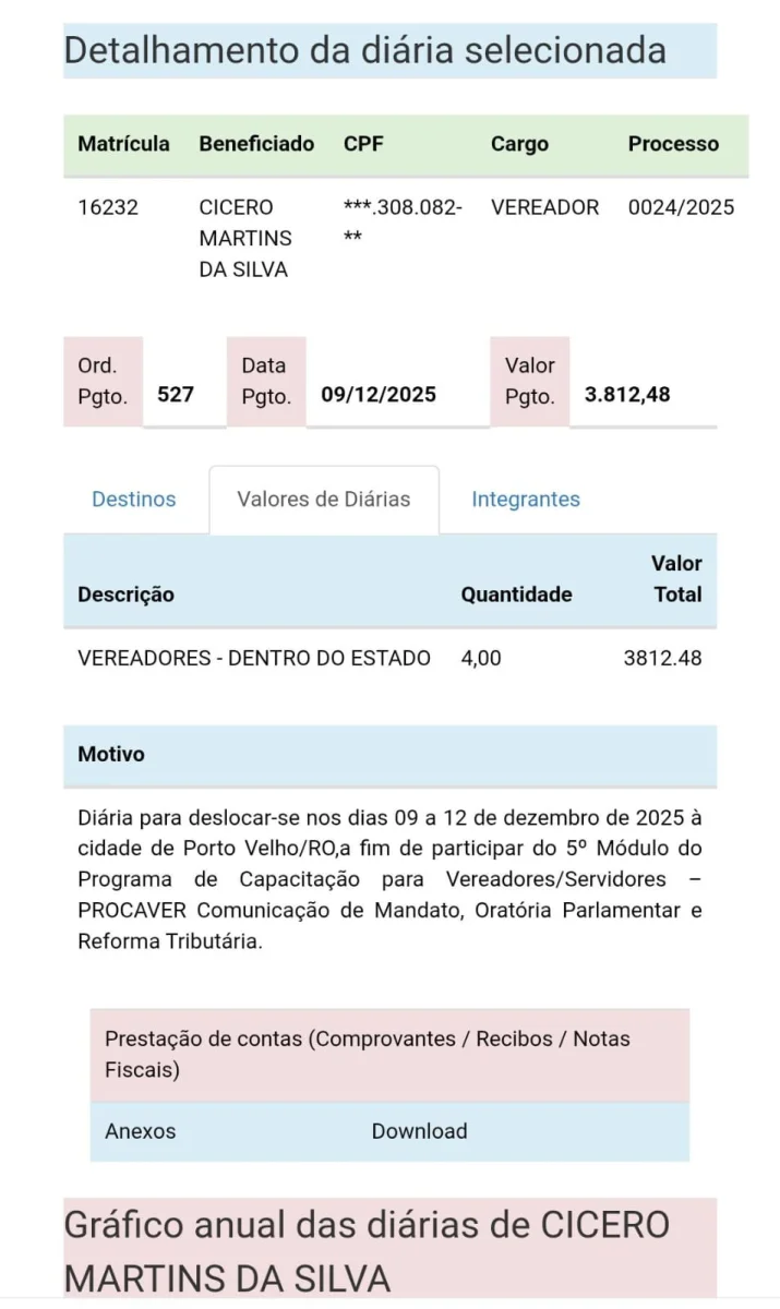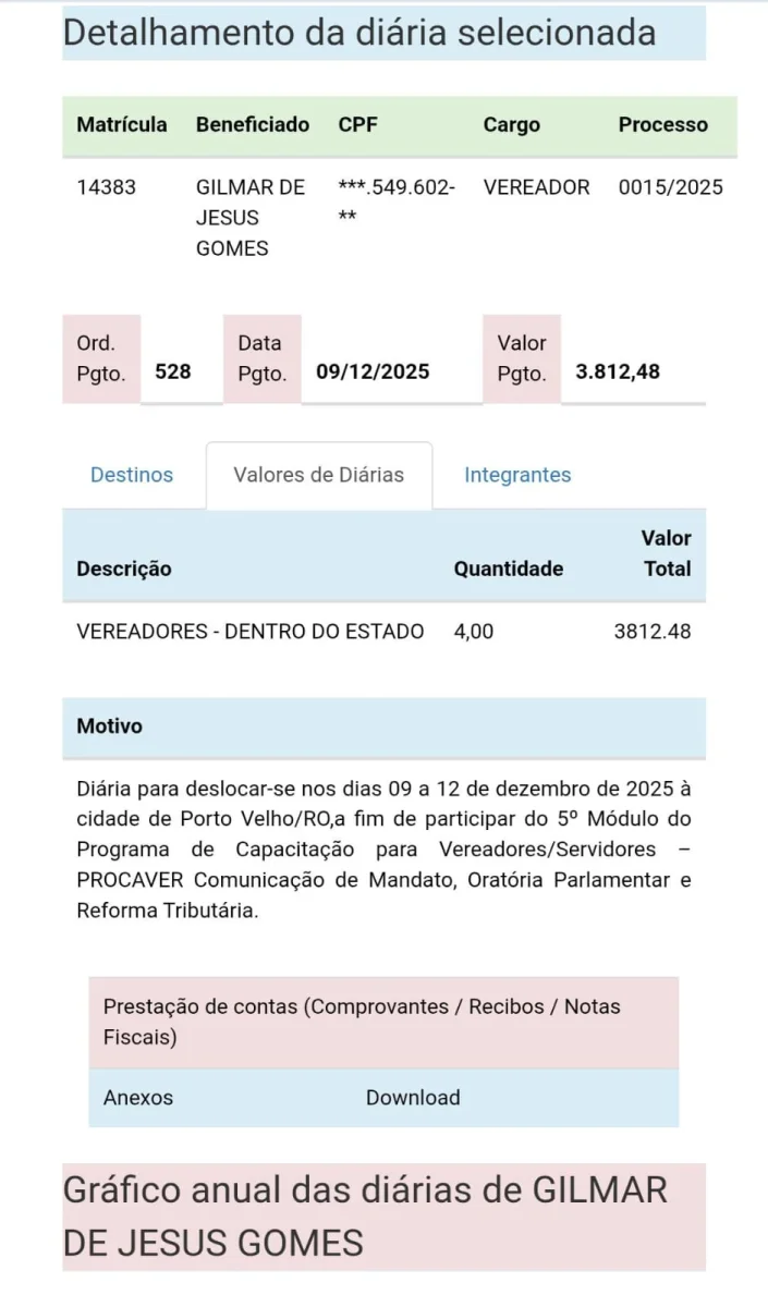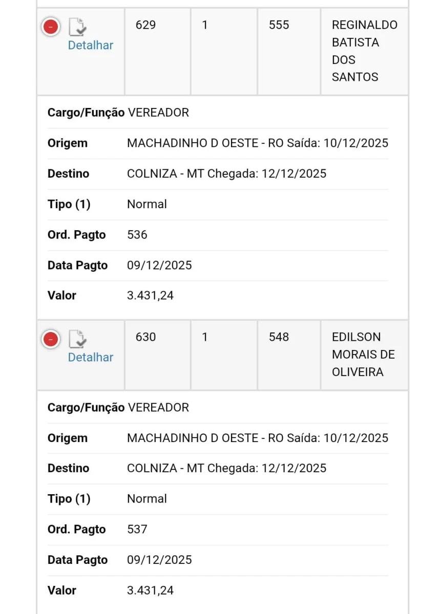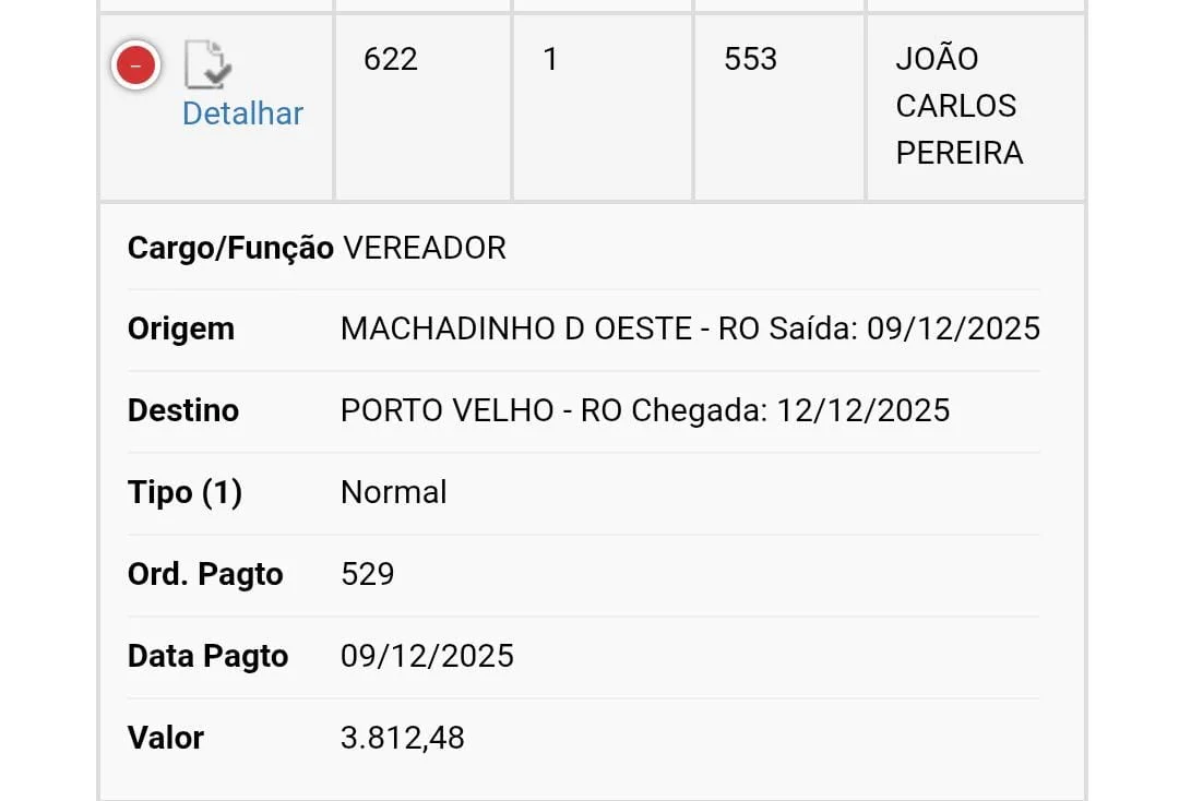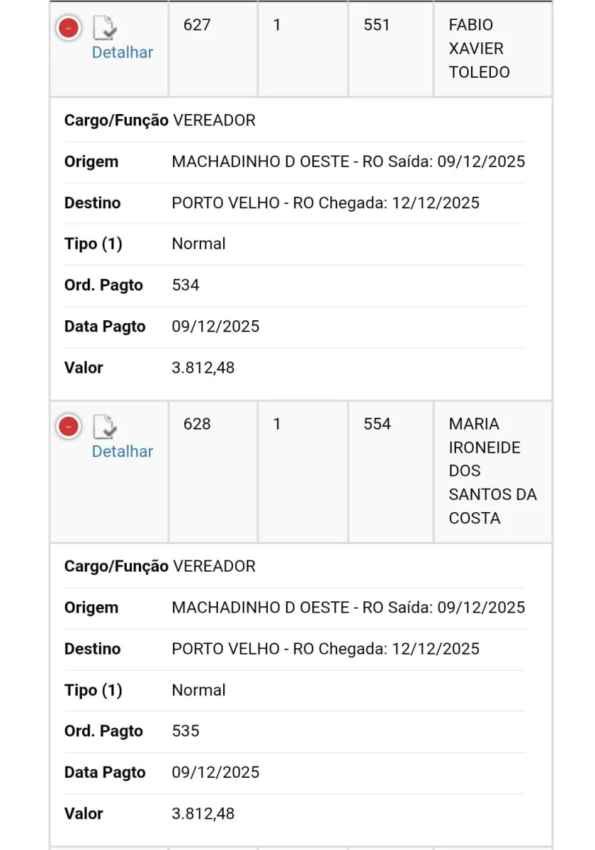 Segundo informações do Portal da Transparência da Câmara, os vereadores viajaram para participar de cursos de capacitação — nove deles em Porto Velho e dois em Colniza (MT). No entanto, moradores questionam a real necessidade dos deslocamentos, principalmente diante dos valores elevados pagos em diárias e da falta de retorno prático dessas capacitações.