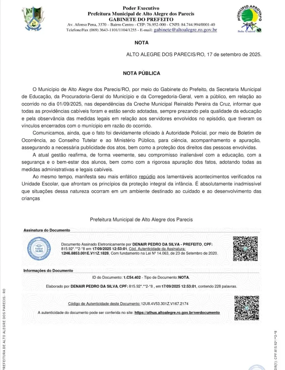 A Prefeitura de Alto Alegre dos Parecis emitiu uma nota oficial. Confira abaixo: