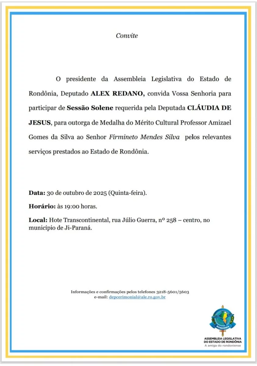 O ator e diretor cultural Firminetto Mendes será homenageado pela Assembleia Legislativa de Rondônia com a Medalha do Mérito Cultural Professor Amizael Gomes da Silva, em reconhecimento aos seus 50 anos de atuação nas artes. A indicação foi feita pela deputada estadual Cláudia de Jesus (PT), e a entrega ocorrerá em uma sessão solene em Ji-Paraná.