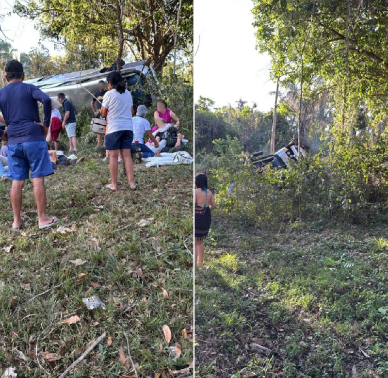 Vídeo que circula na internet mostra o ônibus tombado na região de mata e diversas pessoas no local. Uma mulher aparece com uma criança no colo, chorando e visivelmente em choque por conta do acidente.