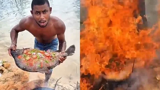 Assim que ele coloca o peixe, uma grande labareda se forma e atinge o corpo dele. Por sorte, o homem não se feriu com gravidade e passa bem.