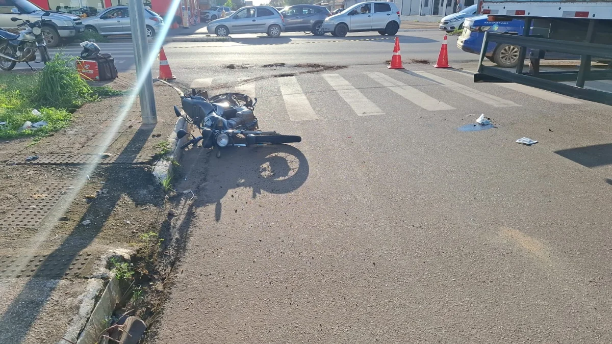 Uma motociclista ficou gravemente ferida após se envolver em um acidente com um caminhão, na tarde desta terça-feira (3), no cruzamento da avenida Guaporé com a rua Primeiro Machado, em Porto Velho.