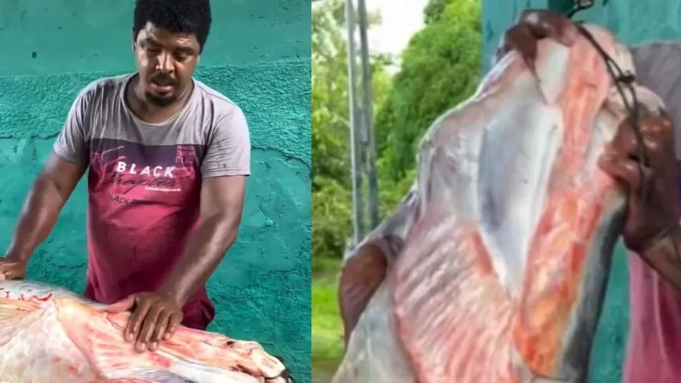 O registro mostra a comemoração do pescador artesanal, que estimou o peso do animal em mais de 100 quilos. A captura, que exigiu cerca de duas horas de esforço do grupo, foi celebrada como um recorde pessoal.